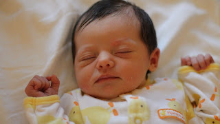 At 11:06 am, with one big push, my little girl came into the world. The first thing I noticed (through the happy tears) was her amazing head of dark hair! She cried a bit and then settled right down when they set her on my chest. She opened her eyes within minutes and looked around...such an alert little girl!